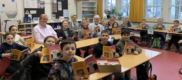 Zur Übergabe kamen Helga Schmitt-Bussinger und Knut Besold von der Bürgerstiftung persönlich in die Schule. Gemeinsam mit der Schulleiterin und dem Autor wurden stellvertetend der Klasse 4c mit ihrer Klassenlehrerin Sophia Leurpendeur einer der beiden Klassensätze überreicht.