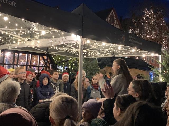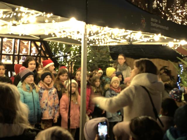 Am Donnerstag, den 11. Dezember 2024, trat unser LUI-Chor gemeinsam mit Kindern der Klassen 4c und 4g vor dem Schwabacher Krippenhaus auf. Wie bereits in den vergangenen Jahren präsentierten unsere Schülerinnen und Schüler ihr weihnachtliches Programm auf dem beliebten Schwabacher Weihnachtsmarkt, dessen Marktplatz festlich golden erstrahlte.