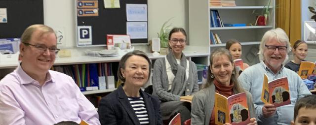 Zur Übergabe kamen Helga Schmitt-Bussinger und Knut Besold von der Bürgerstiftung persönlich in die Schule. Gemeinsam mit der Schulleiterin und dem Autor wurden stellvertetend der Klasse 4c mit ihrer Klassenlehrerin Sophia Leurpendeur einer der beiden Klassensätze überreicht.